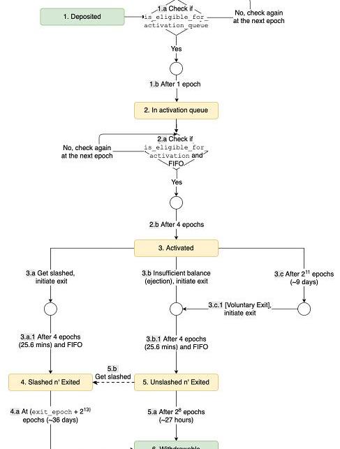 验证者在服务2048个时段之后也可以主动退出。退出时要先走完4个时段,质押用户才能取出自己的权益。在这4个时段内,该验证者的余额仍然是可以被罚没的。因此,诚实验证者的余额可以在约27小时之后取出。但是,如果验证者在此时被罚没,就只有再等8192个时段之后才能取出剩余款项。
