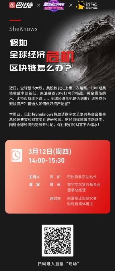 3月12日14:00,巴比特Sheknows将邀请数字文艺复兴基金会董事总经理曹寅和财富变迁史研究者、财经自媒体博主路财主,围绕全球经济形势展开讨论,保住我们的财富不会缩水!点击活动链接:http://t.cn/A6z4G7tS,或者扫描海报二维码观看。