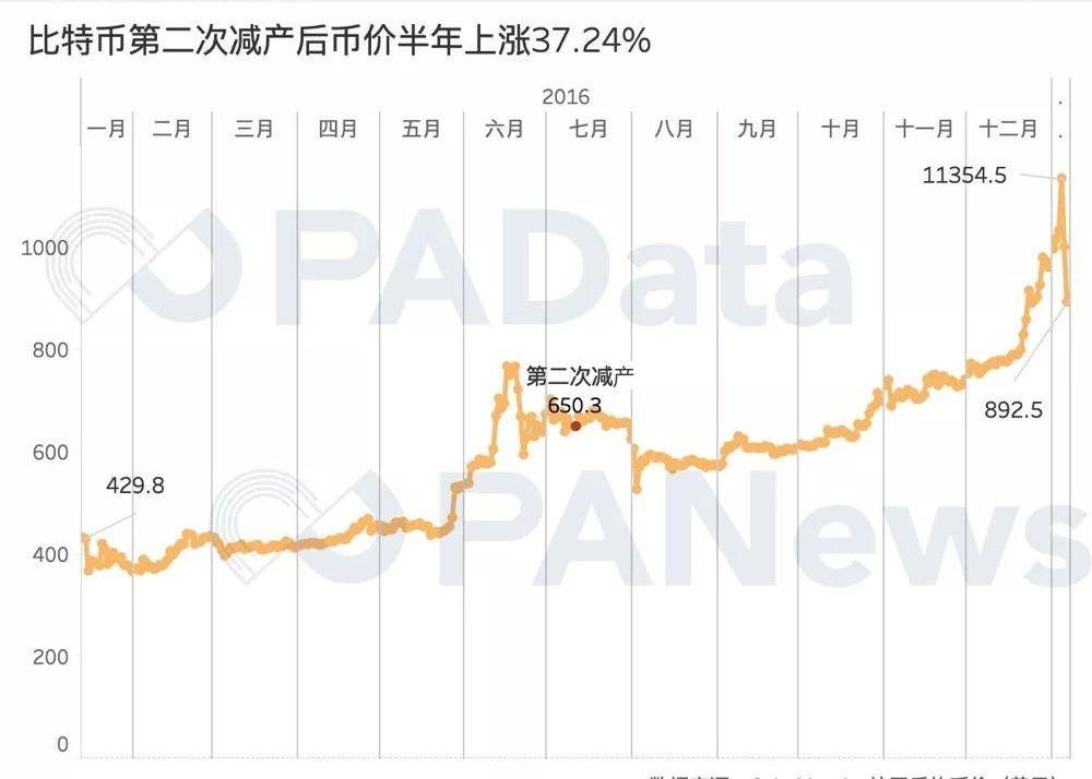 第二次减产时,比特币的币价为650.3美元,减产前半年上涨了51.30%。减产前一个月左右,“减半行情”走出一个小高峰,6月中旬,币价达到了767.4美元。但临近减半时,币价反而有所回调,甚至在减半后的8月初,币价跌至527美元,回到减半前币价开始上涨的起点,此后仍然经历了两个月左右的调整期。第二次减半后半年内,币价涨至892.5美元,涨幅约为37.24%,最高涨至11354.5美元,最高涨幅约为1646.04%。