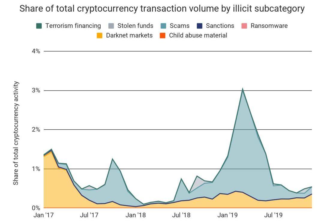 chainalysis数据显示,去年总计有115亿美元的加密货币交易与犯罪活动有关,占总犯罪活动的1.1%。下图显示了自2017年以来,各类型犯罪行为在所有加密货币活动中所占比例的变化。从中可以看出恐怖主义融资所占比例越来越大,而恐怖主义正是美国严厉打击的。