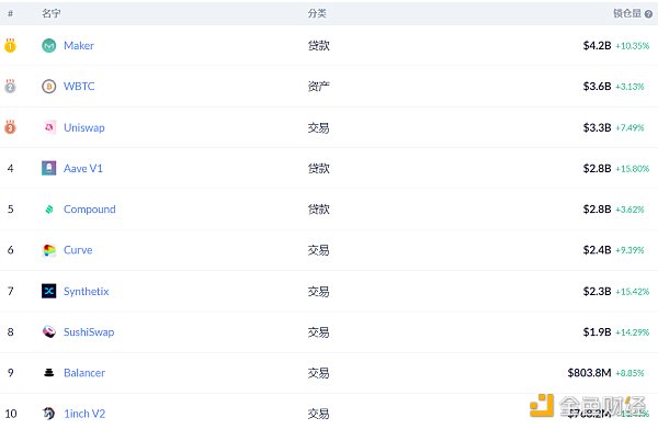 DeFi排名前十锁仓量 数据来源:DeFi Pluse