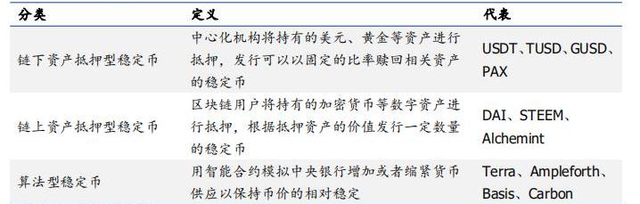 对于市场上存在的稳定币,可以大致分为三类:链下资产抵押型稳定币、链上资产抵押型稳定币、算法型稳定币。第一类为链下资产抵押型稳定币,即稳定币有法定货币、黄金或其他质押商品等资产作为“支持”。中心实体以其所持有的作为抵押的资产为稳定币的发行和赎回进行担保,例如USDT、TUSD、GUSD、PAX等。