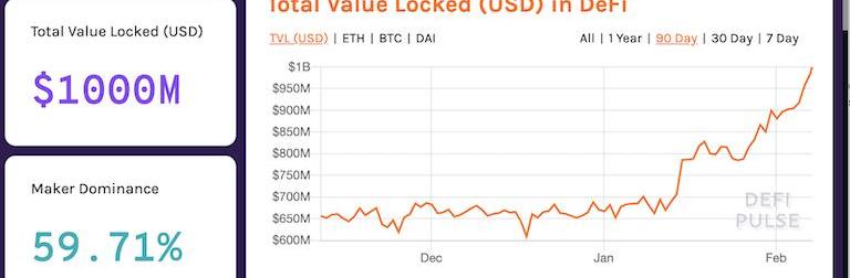锁定在DeFi市场的总价值,2月7日。来源:defipulse.com