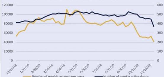 在该份报告中还显示,Dapp上的活跃用户从5月份的11万减少到12月初的4.1万,降幅为62%。并且在统计的10个区块链平台上的周活跃Dapps从529个降到了370个。这一趋势从上图可以很明显地看出,尤其是在2019年年底(图4)。