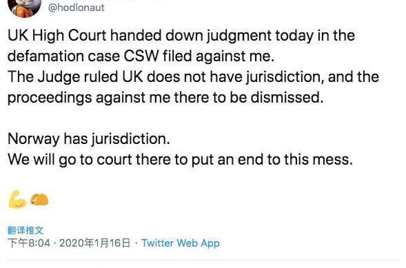 CraigWright头顶自称中本聪带来的争议,尽管其一直无法提供唯一能证明自己是中本聪的证据-私钥,但仍拥有不少支持者,从BCH分叉时其称BSV将坚持比特币的最初路线从而获得了不少原BCH支持者的转投。Wright本人曾遭到众多加密大咖的公开抵制和谴责,包括币安CEO赵长鹏、BlockstreamCEOAdamBack等。而以比特币为首的加密社区曾发起对其的抵制潮,原因是最早公开反对Wright的人之一、受欢迎的比特币支持者Hodlnaut在2019年被Wright起诉,此举引起了加密社区的愤怒。而在1月16日,Hodlnaut在推特宣布,Wright针对其的诽谤诉讼被英国高等法院驳回: