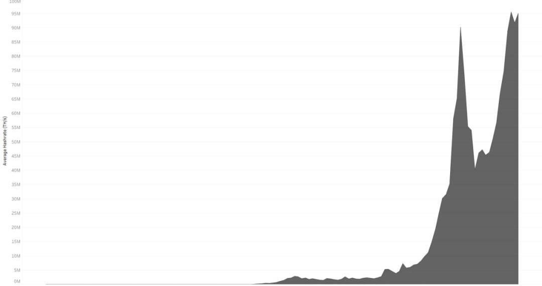 过去十年,挖矿这件事已经从业余爱好转向了大规模的、基于数据中心的大型矿场。截至2019年12月,比特币算力增长到9500万TH/s。