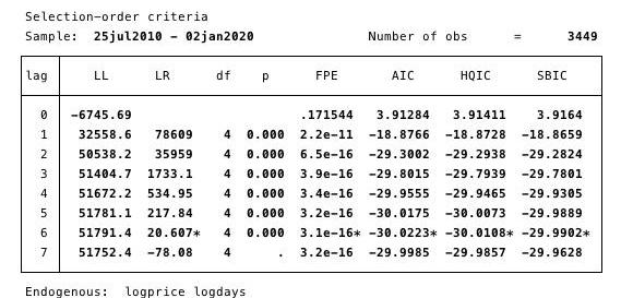 鉴于违反了所有高斯马尔科夫假设的有效线性回归假设,并且没有可检测到的协整性,并且两个变量都是非平稳的,因此有足够的证据拒绝H0,因此没有有效的线性回归。对数价格和对数天数之间的线性关系,因此不能用来可靠地预测样本估计价格。