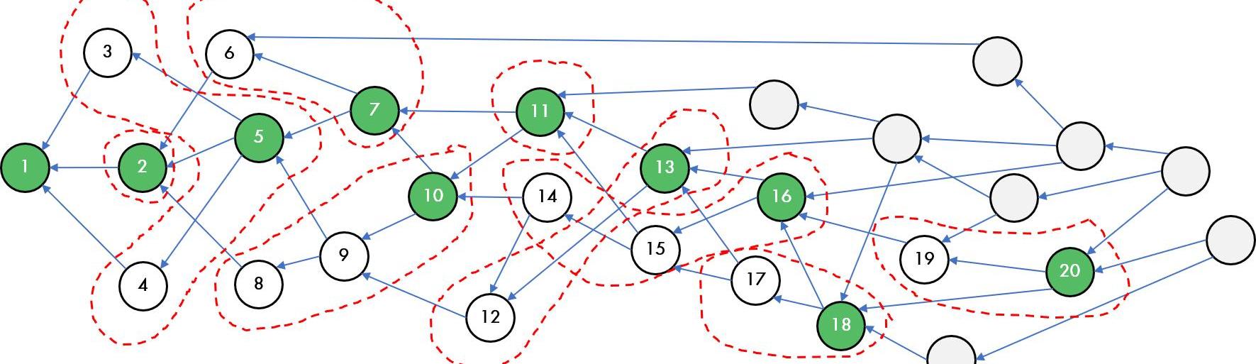在上图中,我们使用红色虚线绘制每个锚块epoch。不幸的是,第一个重量为25的锚块只有他自己是epoch。下一个重量为21的锚块具有epoc,包括它自己和它可以观察到的另外两个重量为1的块。第三个锚块的重量为18,只能观察到一个锚块。下一个块的重量为17,它的epoch为3,其中包括一个块的重量为1是它能够直接观察到,另一个块的重量为2是它间接观察到的。通过这种方法我们继续区分直到每个锚块的epoch都被绘制出来。