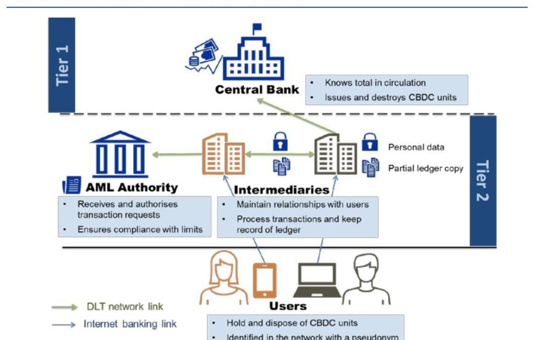 其次,设计是在两层模型中围绕中介体构建的。央行不是直接为CBDC用户提供服务,而是依靠能够进入央行账户、并能够动用央行准备金余额的中介机构,为用户提供CBDC服务。中介人代表客户处理交易,并为客户提供托管服务。