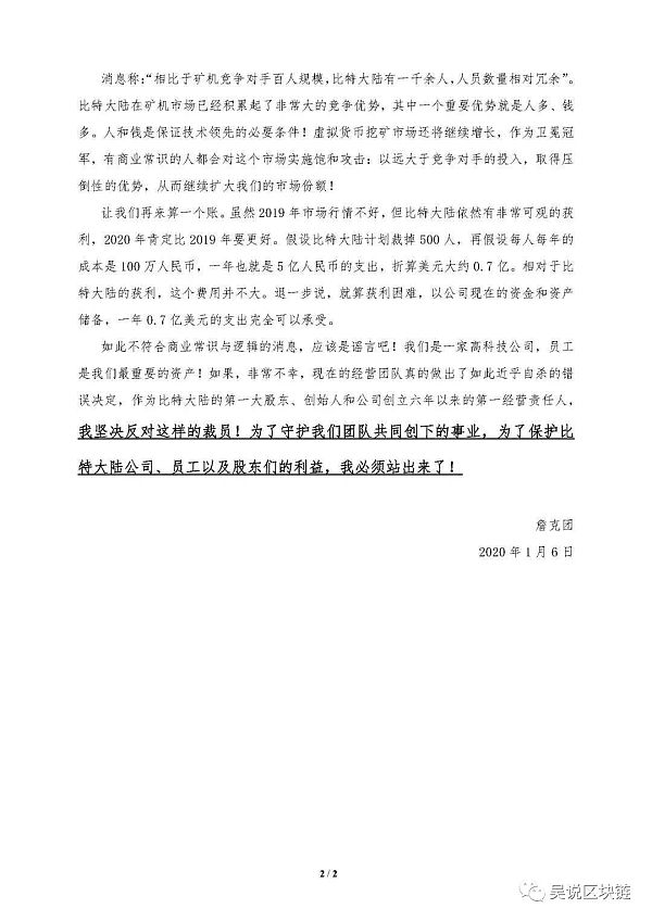 吴说区块链获悉,比特大陆人员优化在1月6日上午启动,赔偿方案是n+1与期权。同日原董事长詹克团发文反对裁员。各家猎头也已得到消息,开始与比特大陆离职员工沟通职位。
