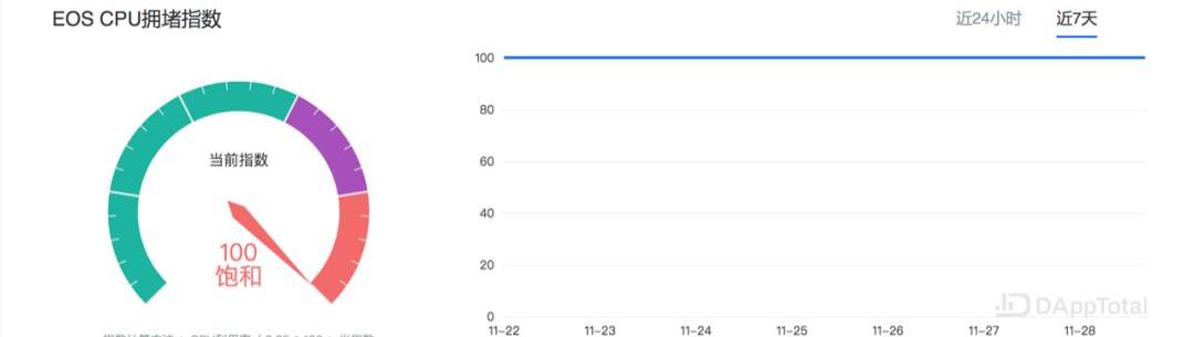 据DAppTotal数据显示,近7天EOSCPU拥堵指数都为100%。