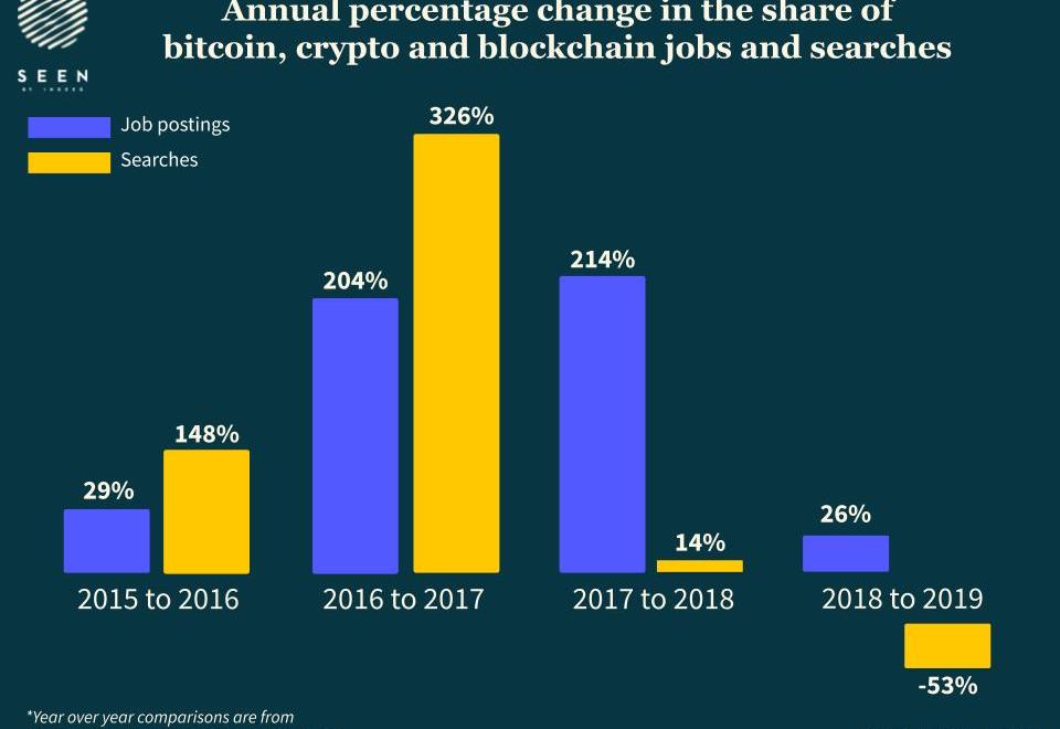 从最近的数据来看,在过去的一年中,加密货币相关的工作信息发布的比例确实增加了26%,而搜索的比例下降了53%。比特币的波动似乎与求职者的兴趣有关,而今年比特币价格的变化可能是求职者减少的原因。