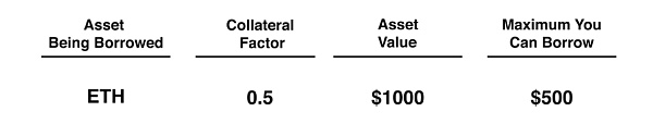 用户可以借入的金额由范围为0到1的抵押因子确定。0.7的抵押因子(CF)等于用户可以借入的基础资产价值的70%。下面是一个示例,说明CF值为0.5时用户可以借多少钱。