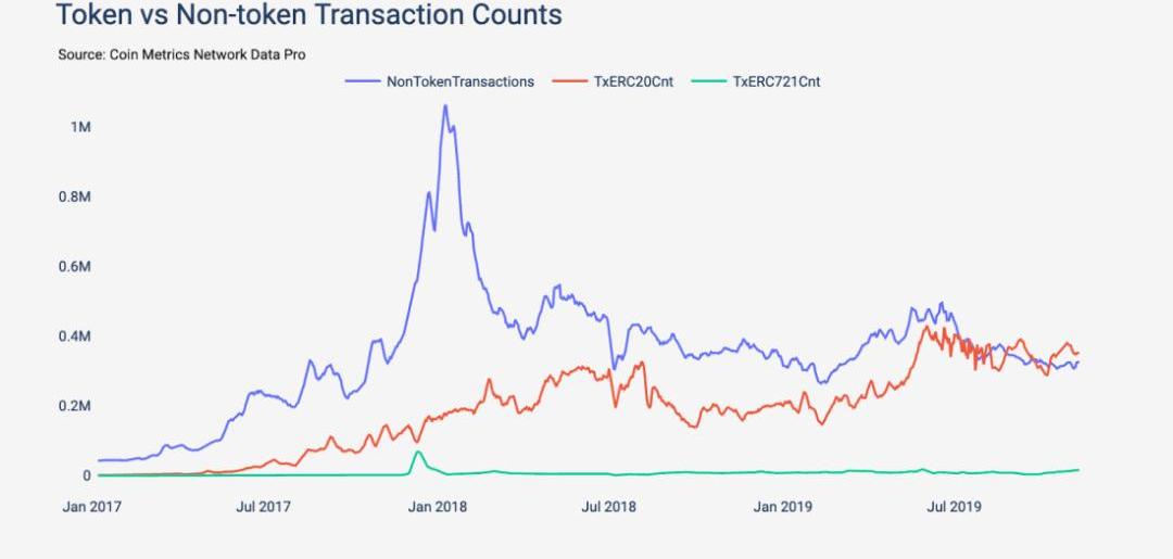 下图显示了ERC-20token的交易笔数、ERC-721token的交易笔数和非token的交易笔数,都使用的是7日滚动平均值。
