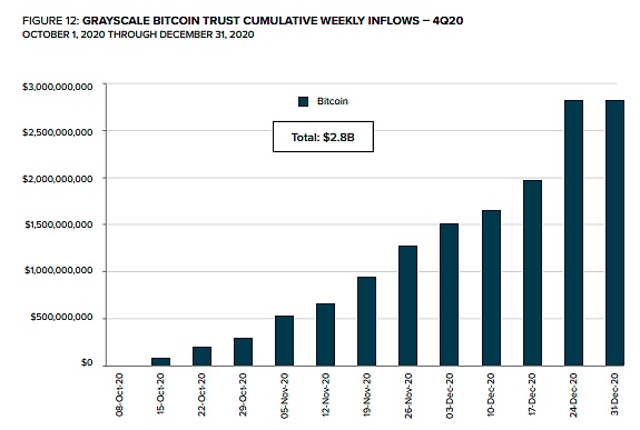 Grayscale在第四季度共流入了33亿美元,使2020全年的流入资金达到57亿美元。