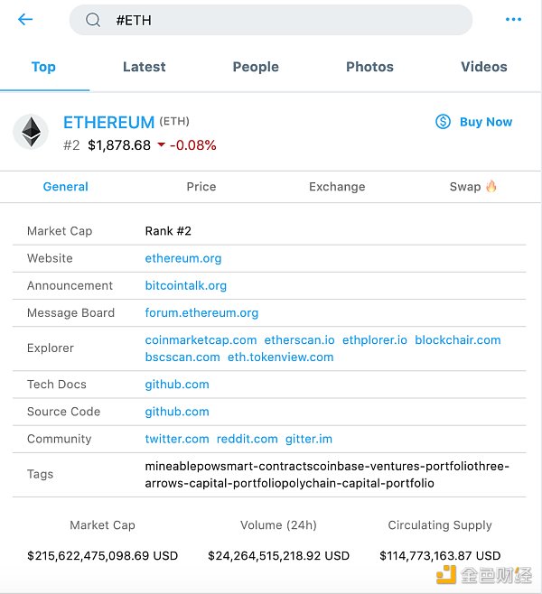 以ETH为例,搜索#ETH,就能看到ETH的基础信息、价格、所在交易所以及Swap。