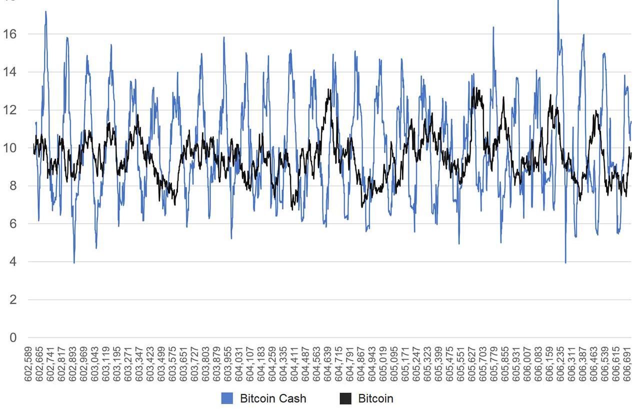 不仅是区块之间的比特币现金时间间隔看起来比比特币更加不稳定,峰值更高而谷值更低,而且其随机性似乎也更小,峰值和谷值更规律。数据可能存在某种形式的周期性,这可能意味着操纵,但我们没有发现任何直接的证据。另一方面,数据的随机性意味着图表可能看起来有周期性,但这可能是错觉。请注意,比特币现金难度是按照每个区块调整的,因此调整算法不应造成此类周期性。还请注意,选择的是50个区块的滚动周期,以最大程度地增大峰值和谷值的大小,因此图表可能对问题略有放大。