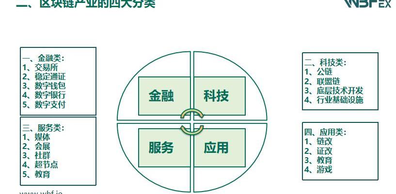 我们把区块链这个产业分成4个类型,分别是金融板块、应用板块、服务板块及科技板块。