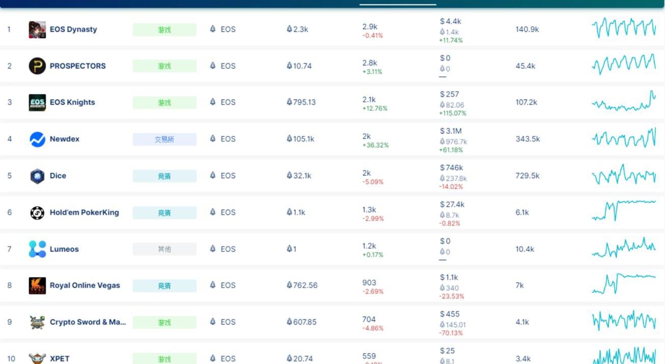 据DappRadar统计数据,24小时EOSDApp整体活跃程度略有回升。游戏EOSDynasty的24小时用户数2.9k,较昨日变化-0.41%;交易应用Newdex的24小时活跃用户数2k,较昨日变化+36.32%;竞猜应用Dice的24小时活跃用户数2k,较昨日变化-5.09%;数据应用Lumeos的24小时活跃用户数1.2k,较昨日变化+0.17%。