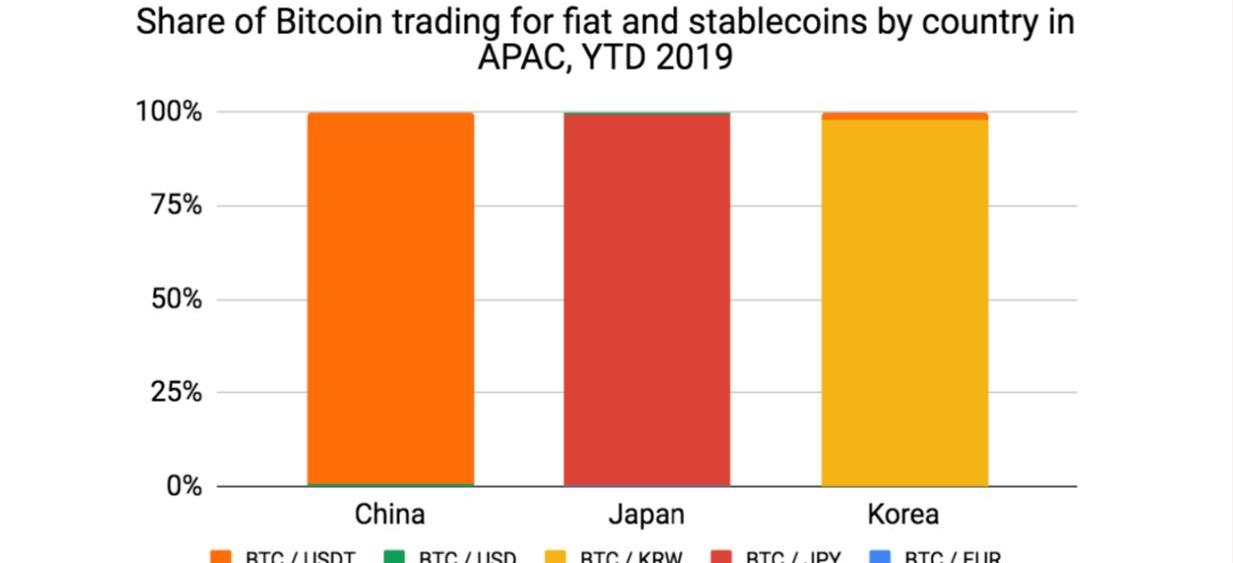 日本和韩国市场几乎100%的比特币交易使用该国官方货币日元、与韩元。但当我们考察中国交易所时,几乎没有人交易比特币时使用人民币。并且这些交易所以前在中国内地,如今继续为中国客户提供服务。几乎100%的交易都涉及将比特币兑换成USDT,反之亦然。换句话说,对于中国的外汇用户来说,USDT已经取代了人民币成为跨境交易的法定货币。