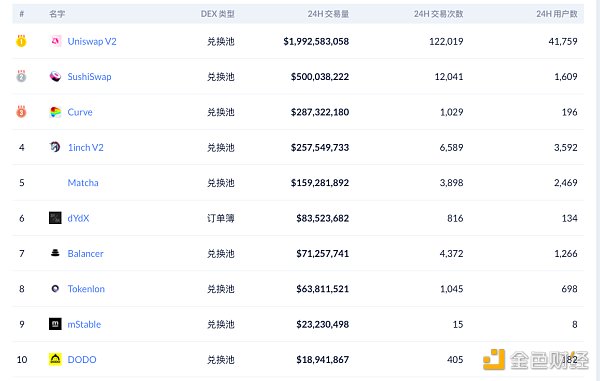 交易量排名前十的DEX 数据来源:Debank