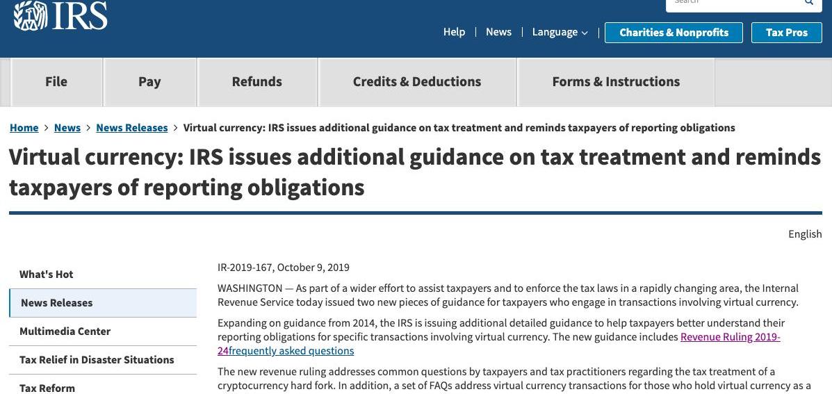 2019年10月9日,美国国税局官网发布一份关于加密货币税收的指南,这是IRS自2014年发布此文件以来的第一次更新。