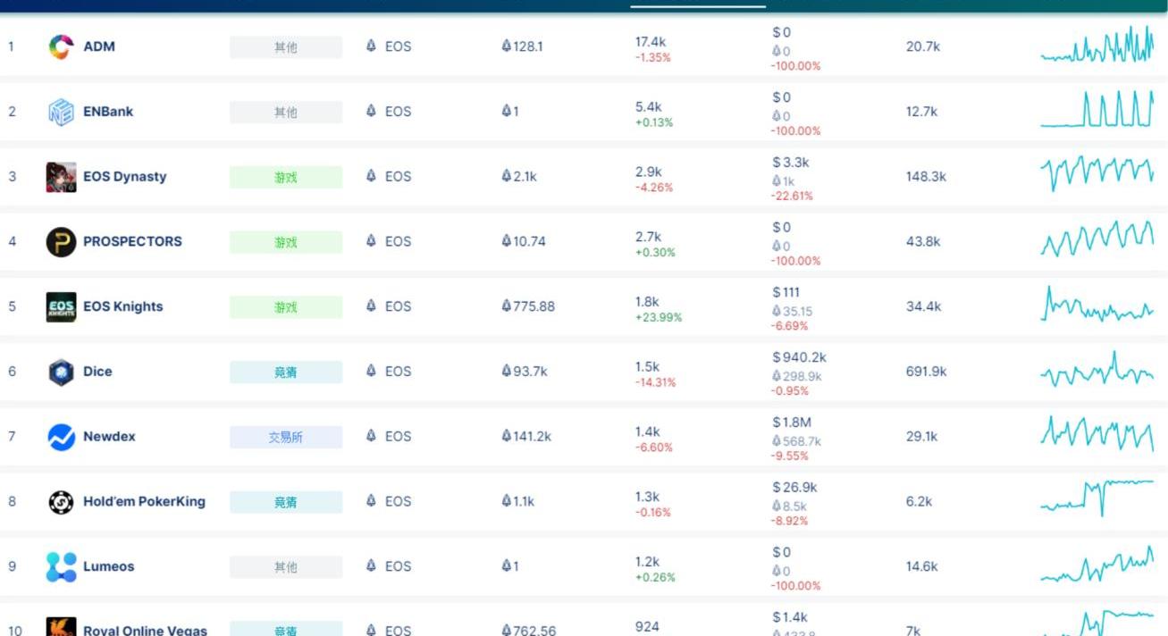 据DappRadar统计数据,24小时EOSDApp整体活跃程度有所回落。游戏EOSDynasty的24小时用户数2.9k,较昨日变化-4.26%;交易应用Newdex的24小时活跃用户数1.4k,较昨日变化-6.60%;竞猜应用Dice的24小时活跃用户数1.5k,较昨日变化-14.31%;数据应用Lumeos的24小时活跃用户数1.2k,较昨日变化+0.26%。