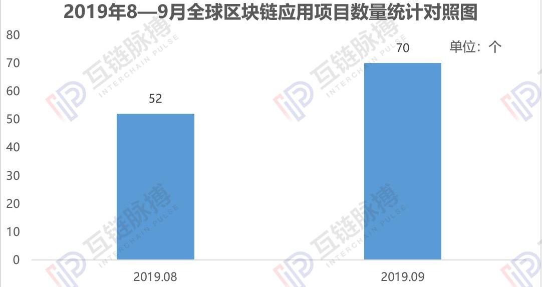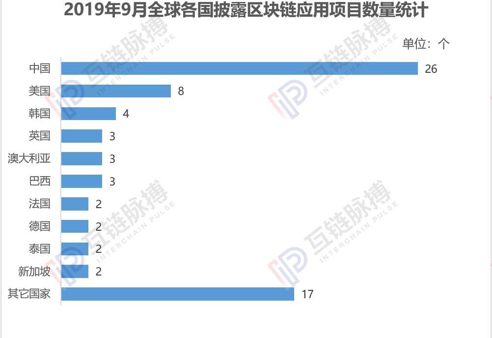 根据互链脉搏研究院不完全统计,2019年9月,全球共披露区块链应用项目70个,环比8月份增长了34.6%。其中中国披露区块链应用项目26个,占比约为37.14%。