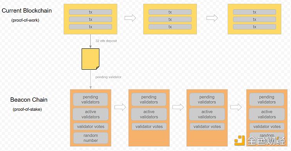 分片链的区块需要一半以上的委员会成员同意。分片链还可以使用信标链来完成跨分片的操作。信标链启动后将与以太坊1.0链并行运行,在此期间并将依赖以太坊1.0链的状态。
