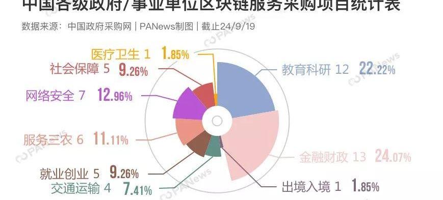 从项目分类来看,PANews根据采购单位性质与项目内容描述将57个项目分为了7个子类,分别是:教育科研、金融财政、出境入境、交通运输、就业创业、服务三农、网络安全、社会保障、医疗卫生。它们各自的数量与百分比情况可参见下图: