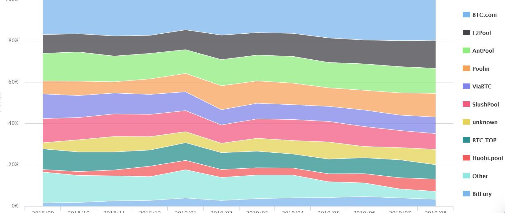 第三,在前五位宝座轮番变动的同时,矿池的算力之争其实越来越激烈。或者说算力其实越来越集中,小矿池越来越难以生存。今年7月,币信矿池宣告停业,原因或许在于,矿池越小,幸运值对短期的影响越大,算力份额低的小矿池亏钱风险很大。算力的集中化或许是不得不面对的一个现实。