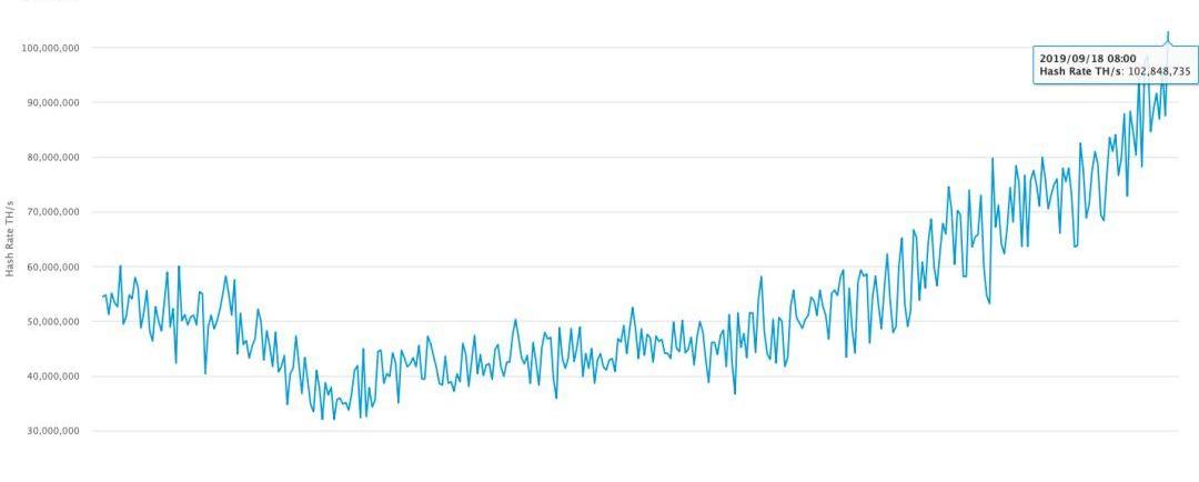 根据Blockchain.com的数据,9月18日比特币全网算力超过了102.8EH/S,而在今年的7月1日,这一数据是56.4EH/S。