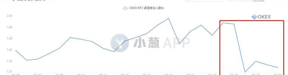 OKEx官方数据显示,本周初一波跳水行情发生后多空持仓比出现了非常明显的同步变化,多空持仓人数比自1.90以上急跌至1.00附近,并一直保持在1.00附近运行。即OKEx交易所合约投资者此前强烈的看涨偏好在价格出现急跌后遭到了扭转,目前多空双方基本持平的状况反而在一定程度上提升了该指标在未来发生变化时的参考价值。对于这一指标来说,下一步重新回到1.5以上或者进一步跌至0.8以下,将成为判断市场情绪的关键所在。