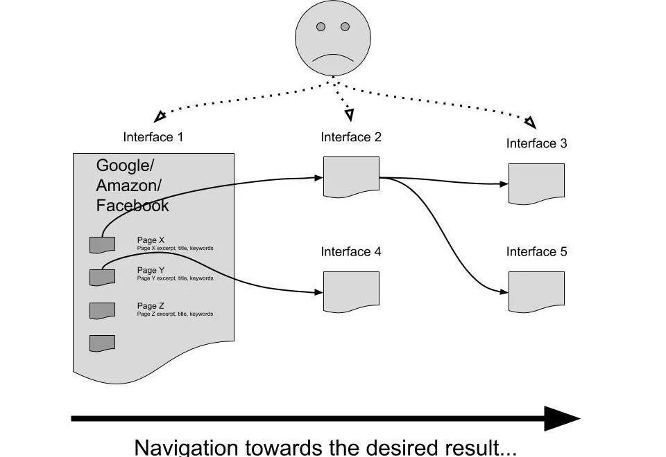 在人类用户看来,web网络是怎么一回事呢?连篇累牍的浏览,搜索并试图理解每个接口所指向的资源。当前的“解决方案”是使用少量公司提供的“最顶级”的网站,它们有足够的资金来构建易用的接口。而这会进一步减少竞争,使得新的网站难以被发现和使用。