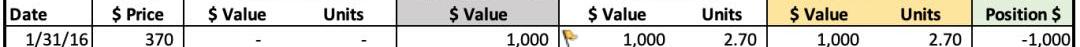 为了达到我们的目标,我们花了1000美元,以370美元的价格购买了2.7BTC。表中BTC买/(卖)列。