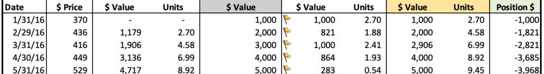 我们最初的比特币头寸是零,也就是比特币的数量,单位都是美元。我们的目标是比特币持仓量每月增加1000美元,所以第一个月比特币持仓量的目标是1000美元。