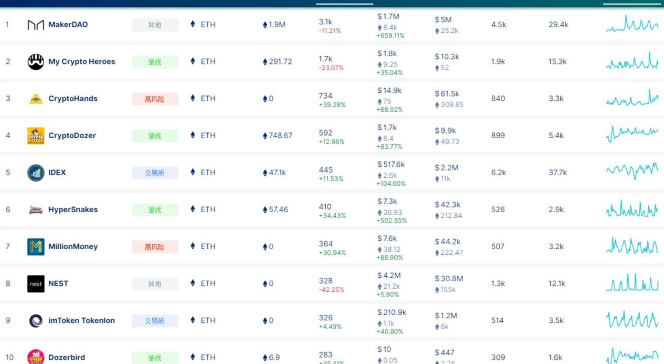 观察DappRadar统计数据,24小时ETHDApp整体活跃程度有所回落,新增5个DApp。其中,金融应用MakerDAO的24小时活跃用户数3.1k,24小时变化-11.21%;游戏应用MyCryptoHeroes的24小时活跃用户数1.7k,24小时变化-23.07%;交易应用IDEX的24小时活跃用户数445,24小时变化+11.53%。