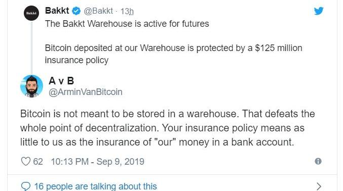 “比特币不应该存在托管仓库里。这就违背了去中心化的初衷。你们的保险政策对我们来说就像给银行账户里‘我们’的钱上保险一样微不足道。”