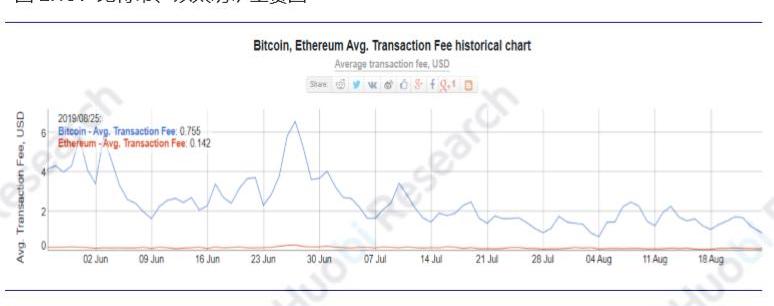 本周比特币矿工费下降、以太坊矿工费上升。截止2019年8月25日,比特币当日平均每笔矿工费为0.755USD,环比下跌30.54%,以太坊每笔矿工费为0.142USD,环比上升60.09%。