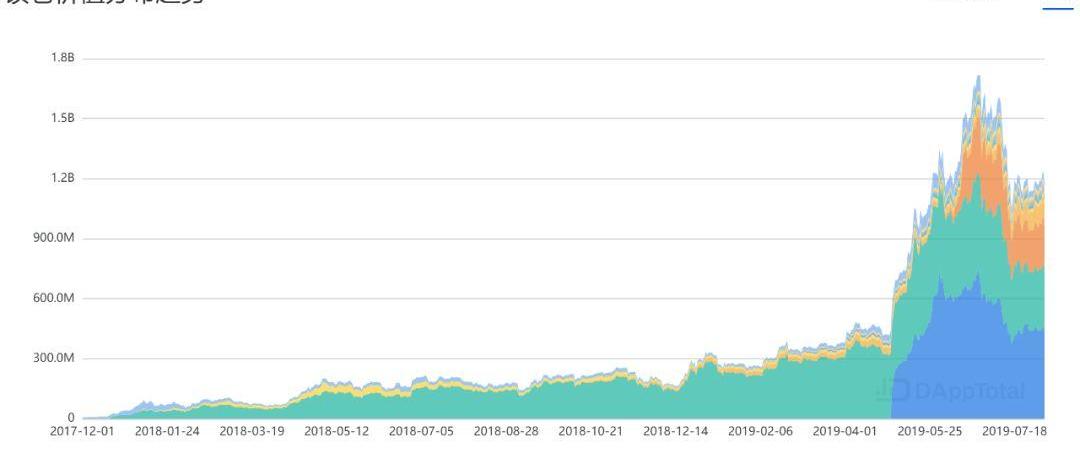 如果把锁仓金额看作「DeFi」市场总体规模的衡量标准,在2019年4月之前,整体生态的总市值只有不到3亿美金,随后的两个月时间,总的锁仓金额增长了近6倍,最高达到了近17.2亿美金,目前稳定在11亿美金左右。