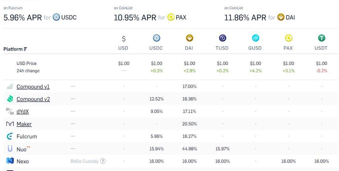 根据「DeFi」借贷项目统计平台Loanscan.io的数据,使用「DeFi」产品融资的利率最优的为USDC,最低年化利率为5.96%,而USDC平均的年化借币利率约为11.74%。在「DeFi」里最常使用的稳定币DAI的平均年化借币利率为20%。