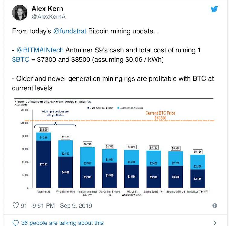 根据@fundstrat最新的比特币挖矿更新数据,假设电费为每千瓦时0.06美元,那么比特大陆的蚂蚁矿机S9挖出1枚比特币的总成本在7300美元到8500美元之间。币价在当前的水平上,新老矿机都是有利可图的。