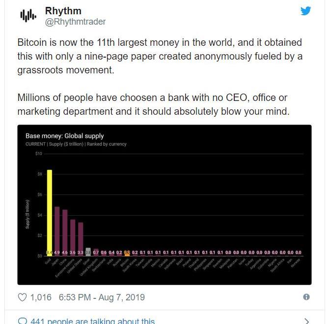 加密货币交易员和分析师Rhythm在推特上指出,比特币目前是全球第11大货币。对于一个10岁的后起之秀来说,这是相当令人印象深刻的,尤其是其源于一份9页的匿名白皮书。