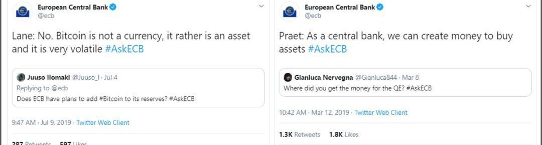 欧洲央行也在推特上发表类似的观点:比特币“不是一种货币”,而是一种“非常不稳定的资产”,并强调该央行可以“创建用于购买资产的货币”。但实际上,央行的这种“创建货币”职能正是导致货币贬值并成为一种不良价值存储手段的罪魁祸首。