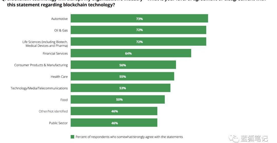 2018年底,德勤在采访了1,000位看好区块链技术的企业高管后发布了一份报告,总结了它们19年的计划。其中,95%的高管表示,他们的公司计划在2019年投资区块链技术。近40%的高管计划投资至少500万美元。84%的高管认为区块链是具有扩展性的,并将实现大规模主流应用,但也有39%的高管认为该技术目前“被过度炒作”。在德勤的报告中,来自汽车、石油和天然气以及生命科学行业的高管对区块链技术的前景最为看好,紧随其后的是金融服务行业的高管。