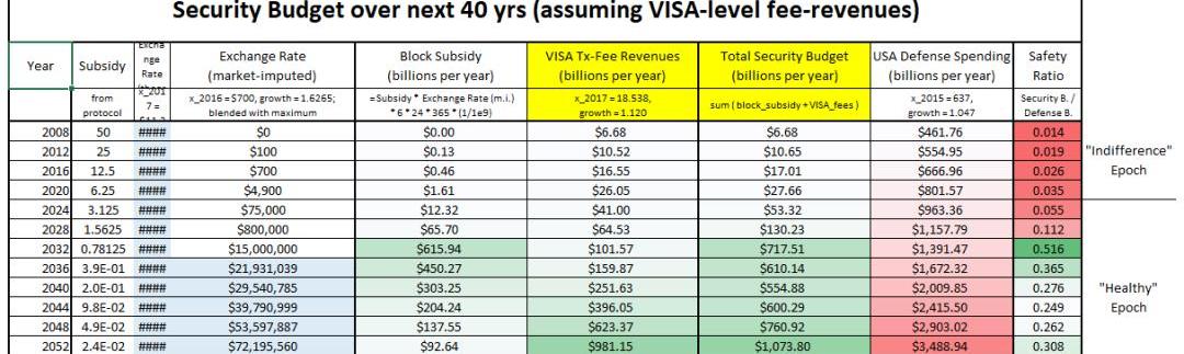 上表是上文中的“安全预算表”加入了新的一栏:VISA交易费。这些交易费加上基础的区块奖励,算得了最终的新安全预算。
