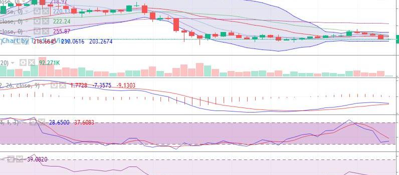 BCH跌破了布林带中轨,当前走势在中下轨区域运行,调整阶段也会因此而拉长,若能回归到布林带中轨之上,则压力减弱,保持低位跟进的思路。