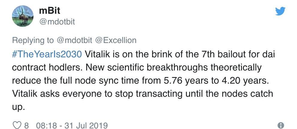 “时间来到2030年。Vitalik正处于第七次救助稳定币DAI合约持有者的边缘。新的科学突破理论上可以将全节点的同步时间从5.76年减少到4.20年。Vitalik要求大家停止交易,直到所有节点完成同步。”