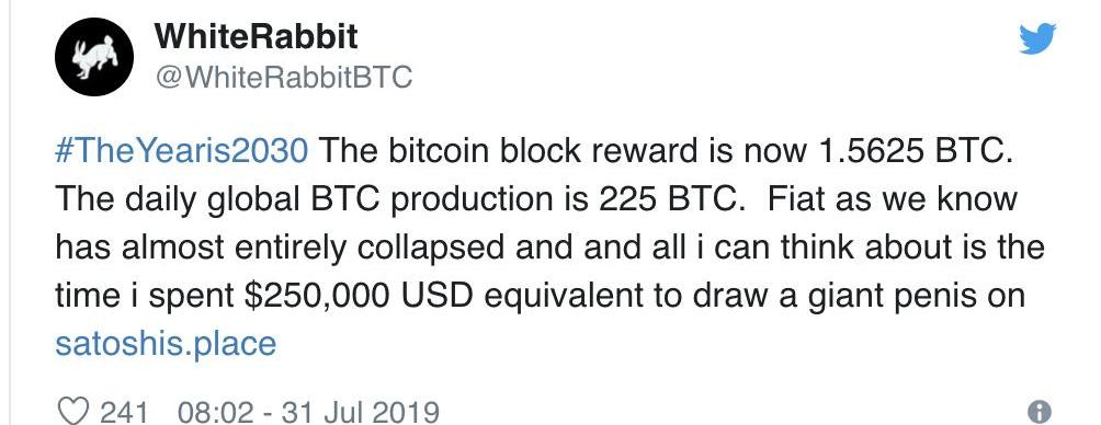 “时间来到2030年。比特币区块奖励为1.5625BTC。比特币全球的日产量为225BTC。美元法币系统已经基本彻底蹦跶。拿着25万美元,我能想到唯一事情就是拿这些美元换成等值的BTC在satoshis.place上画一个巨大的xx。”