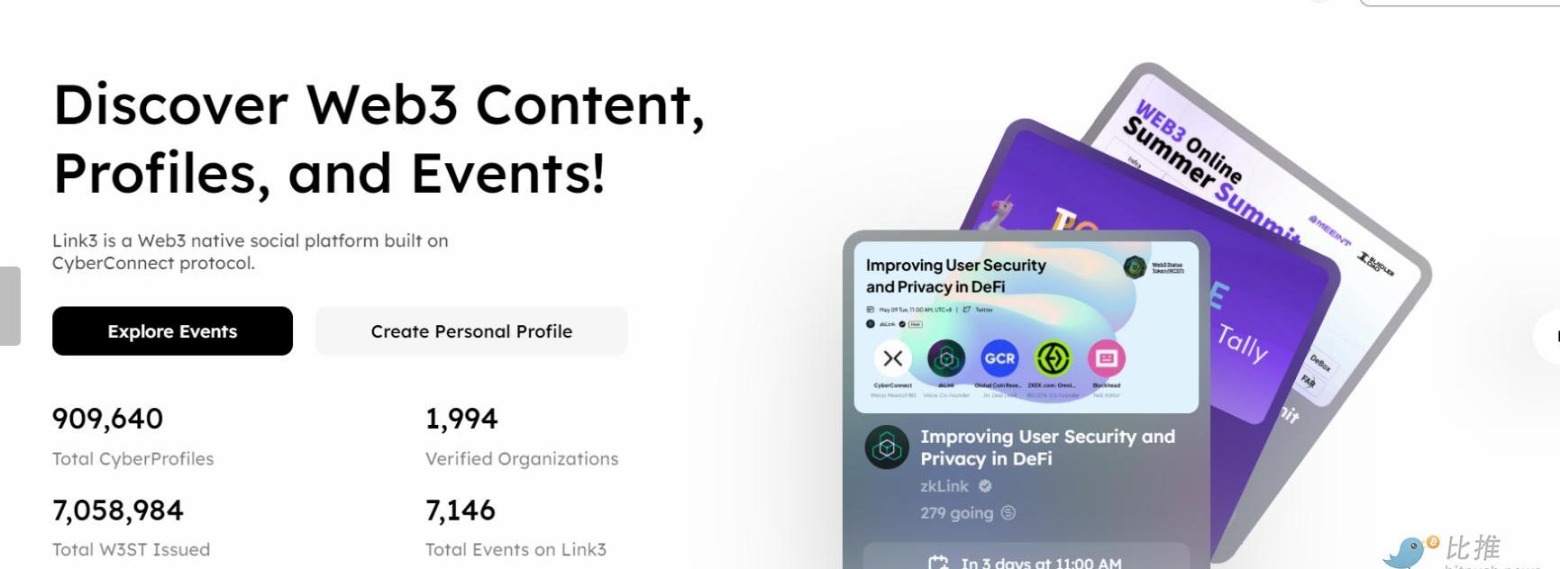 首先,CyberConnect打通Web2和Web3渠道,实现链上和链下数据互通,并构建出相对完善的Web3社交体系。早在2022年7月,CyberConnect就宣布推出基于该协议的首个Web3原生社交信息产品Link3,为该协议构建真实应用场景。Link3通过个人资料页NFT?汇集了用户的链上和链下数据。用户可通过在CyberConnect平台链接钱包地址,铸造一个ccProfileNFT。通过设置ccProfile资料,聚合链上和链下相关数据,如可将链下的推特、微信号等社交平台身份链接、个人资料等数据及链上的证明如持有的NFT、POAP等聚合到一个页面上,打造自己的链上账户体系。除了ccProfile,Link3平台上还集成了Post、Event、FanClub等功能。另外,CyberConnect还推出灵魂代币SBT——W3ST,用于记录用户在链上互动行为和数字声誉,项目方也可在Event活动中用W3ST设置相关任务激励用户参与。根据Link3官方数据显示,截止5月6日,已认证的组织账号由1994个,已发行了7058984个W3ST,发布的活动事件有7146个。